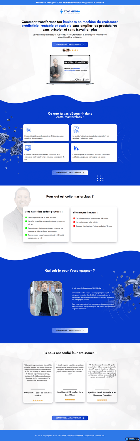 J’ai lancé mon activité avec une vision simple : aider les coachs, formateurs et e-commerçants à obtenir des résultats concrets grâce à des tunnels de vente performants, esthétiques et adaptés à leur image sans exploser leur budget.